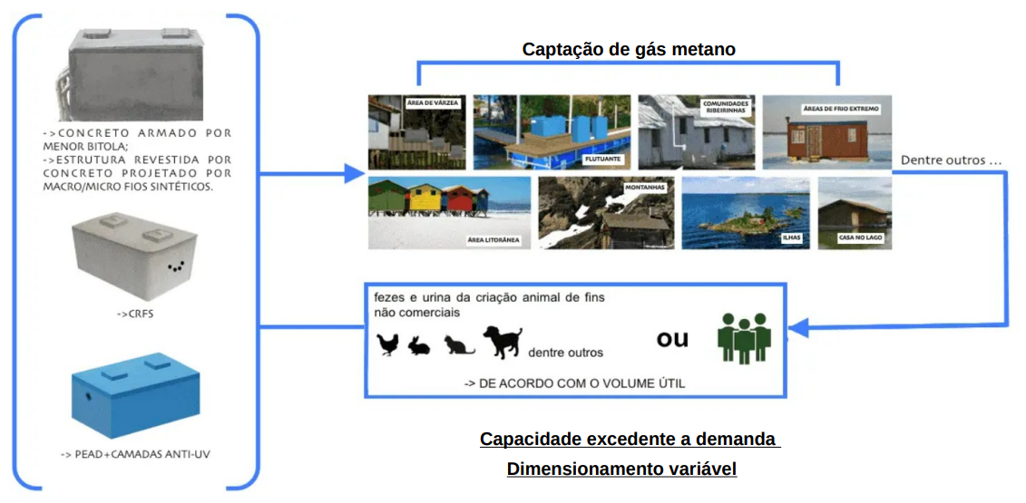 Na ligação intradomiciliar com o tanque séptico há um componente que faz a ventilação, que pode receber adequações de captação do gás metano, ciente que, no TSDF o gás é produzido temporariamente pela câmera de armazenamento. O gás metano pode ser armazenado de forma cumulativa (a exemplo do método do Gás Liquefeito de Petróleo-GLP), para ser reutilizada, ao mesmo tempo que condiciona e transforma o lodo digerido para desidratado, tratando o chorume oriundo dessa compressão junto com a água do esgoto afluente.