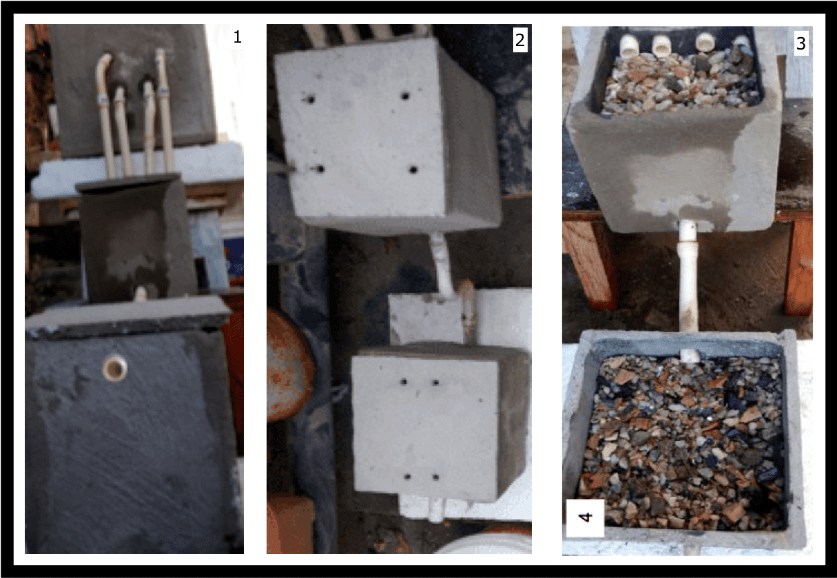 - Os filtros aplicados abaixo da superfície do solo, apoiados ou elevados condicionam a inclusão obrigatória de carvão vegetal, ou ecológico (briquete) de granulometrias variáveis (do menor tamanho para o maior ou vice-versa) por camada e brita nº 3; Para os filtros aplicados abaixo do solo, essa inclusão ocorre somente no primeiro filtros, interligado direto ao TSDF. Nas demais opções, essa inclusão são nos dois filtros.